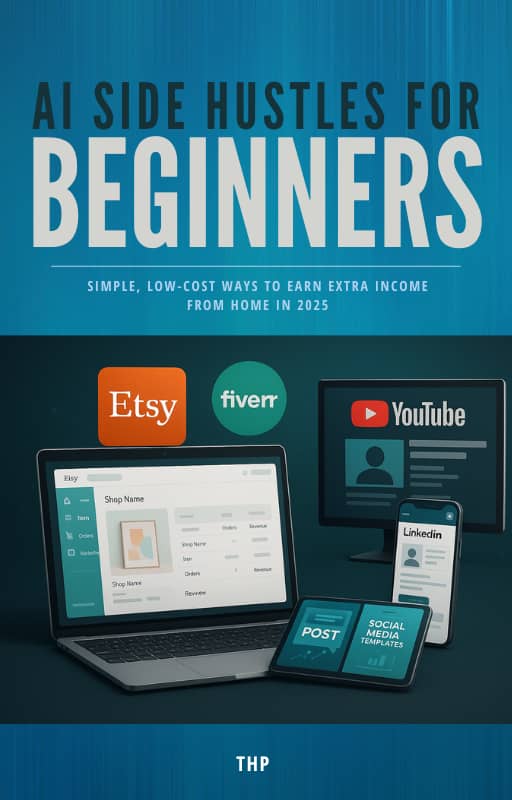 AI Side Hustles for Beginners shows you simple, low-cost ways to start earning extra income from home using tools like ChatGPT, Canva, Etsy, Fiverr, YouTube, and more.